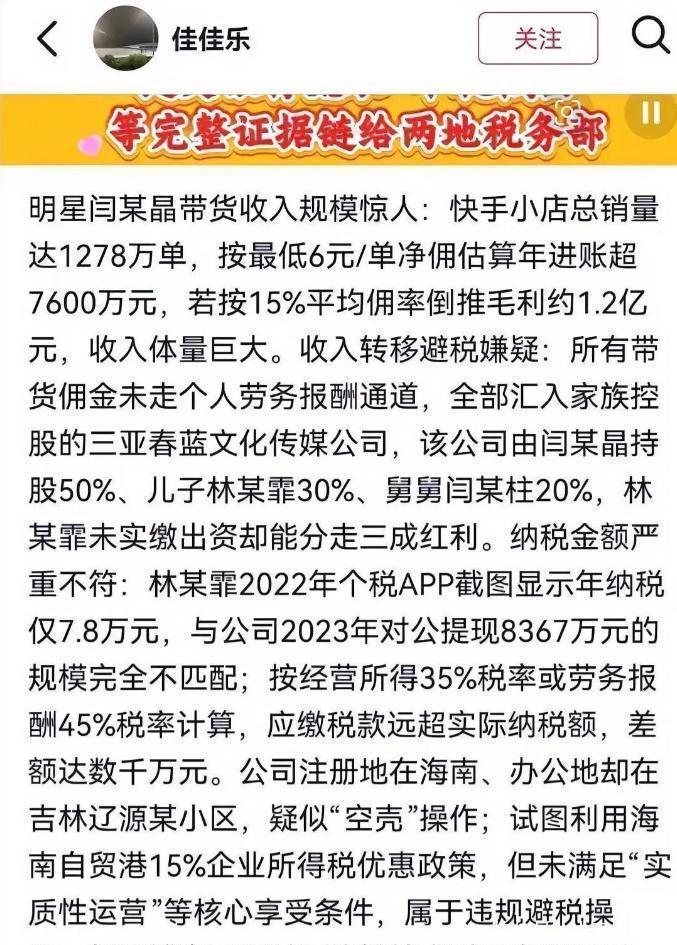 终止合作关系仅仅是起点,不久后就有人实名指控闫学晶及其儿子林傲霏涉嫌逃税漏税。还提到她名下的几家公司,注册地点与实际经营所在地不一致,疑似存在违法操作的可能性。
